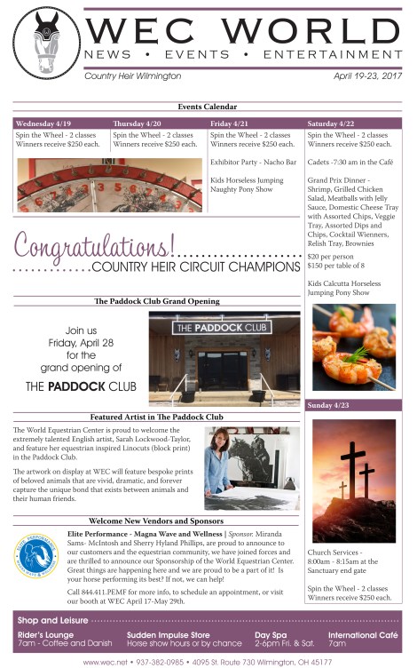 The Paddock Club is an expansive, beautifully decorated gathering place and event space featuring equestrian inspired décor and original linocuts by Sarah Lockwood-Taylor. Open to WEC exhibitors, the Paddock Club features a bar, games, flat screen TVs, a grille menu and grab n’ go food. Continue reading>